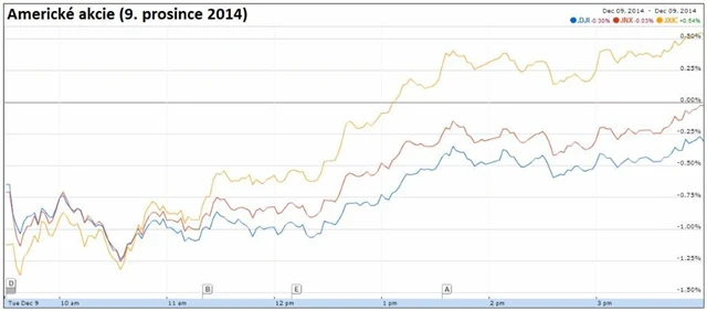 Dow oslabil o 0,29 % na 17 801,20 bodu a širší S&P 500 klesl o 0,02 % na 2 059,82 bodu. V zelených číslech uzavřel ze tří nejsledovanějších indexů pouze technologický Nasdaq, který posílil o 0,54 % na 4 766,46 bodu. Index volatility VIX vzrostl o necelých pět procent na 14,89 bodu a výnosy 10letých vládních dluhopisů USA klesly o 4 bazické body na 2,21 %. Benchmarkový index akcií firem s malou tržní kapitalizací Russell 2000 vzrostl o 1,79 % na 1 188,06 bodu.