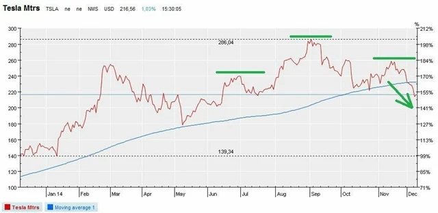 Přes procento posílily cenné papíry automobilky Tesla Motors (+1,18 %), které tak přerušily sedmidenní šňůru poklesů. Akcie výrobce elektrických automobilů se pod tlak dostaly poté, co se jejich cena na začátku prosince dostala pod 200denní klouzavý průměr, který mnozí obchodníci považují za jeden z rozhodujících ukazatelů ohledně dalšího vývoje. Na grafu ceny akcií Tesla Motors se navíc vytvořila formace "hlava a ramena", která poukazuje na možnost jejich zlevnění pod 200 dolarů, a analytici taktéž upozorňují, že 200denní klouzavý průměr v pondělí poprvé od konce ledna 2013 vykázal pokles.