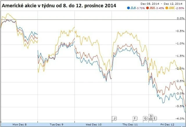 Americké akcie v závěru týdne výrazně ztrácely. Index S&P 500 zažil největší týdenní pokles za posledních dva a půl roku kvůli pokračujícímu zlevňování ropy a datům z čínského průmyslu.