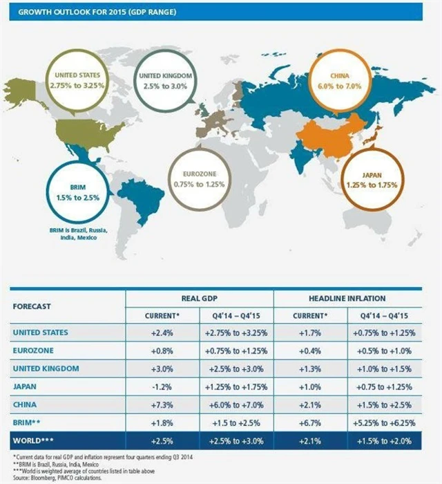 PIMCO odhaduje, že v roce 2015 světová ekonomika posílí o 2,75 % a americká vzroste o 2,75-3,25 %. Počítá přitom s tím, že levná ropa bude nadále brzdit růst spotřebitelských cen. Ke konci roku 2015 a v roce 2016 by již nicméně mělo dojít k odrazu inflace ode dna a na scénu by se mělo podle PIMCO vrátit zdražování.