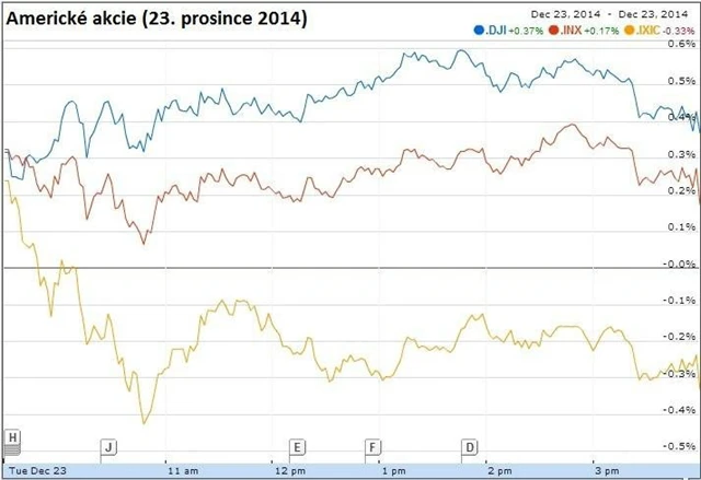 Index Dow v úterý zpevnil o 0,36 % na 18 024,17 bodu, čímž překonal předchozí zavírací rekord z 22. prosince 17 959,44 bodu. Zároveň posunul intradenní rekord na 18 069,22 bodu. Index S&P 500 rovněž překonal rekordy - intradenní posunul na 2 086,73 bodu a zavírací rekord z 22. prosince (2 078,54 bodu) přeskočil a uzavřel se ziskem 0,17 % na 2 082,17 bodu. Horší náladu v závěru seance způsobilo několik kusých zpráv o ebole. Technologický Nasdaq šel proti trendu a ztrácel 0,33 % na 4 765,42 bodu. Důvodem byl další propad sektoru biotechnologií.