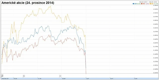 Většina středeční sváteční obchodní seance se na amerických akciových trzích nesla ve znamení zisků. Santa Claus investorům odpoledne dokonce nadělil nová rekordní maxima indexů Dow a S&P 500. V závěru obchodování se ale vánoční nadšení vytratilo a všechny tři nejsledovanější indexy své zisky odevzdaly. Ve čtvrtek zůstanou americké burzy zavřené, již v pátek se na ně ale aktivita zase vrátí.