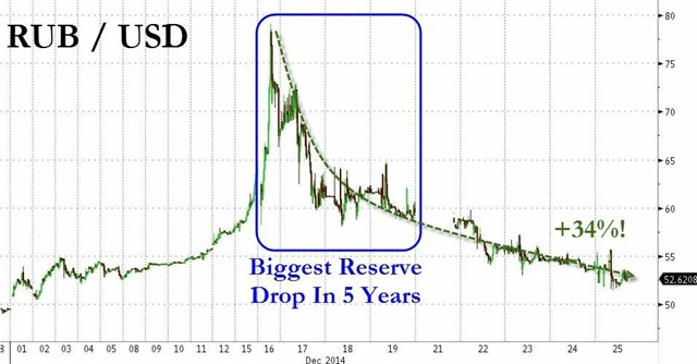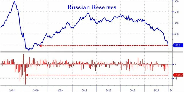Ruské devizové rezervy kvůli snaze centrální banky zachránit rubl klesly v týdnu do 19. prosince o 15,7 miliardy dolarů a jejich celková hodnota spadla na 398,9 miliardy dolarů, což představuje největší pokles od ledna 2009.