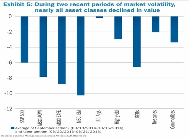 Vše je postaveno na jednoduché logice, že když jeden druh aktiv klesá, druhý roste. Poslední dvě období zvýšené volatility - spekulace o ukončování QE v roce 2013 a září 2014 - však ukázala, že tato strategie už nefunguje. V těchto obdobích klesala všechna aktiva zároveň.