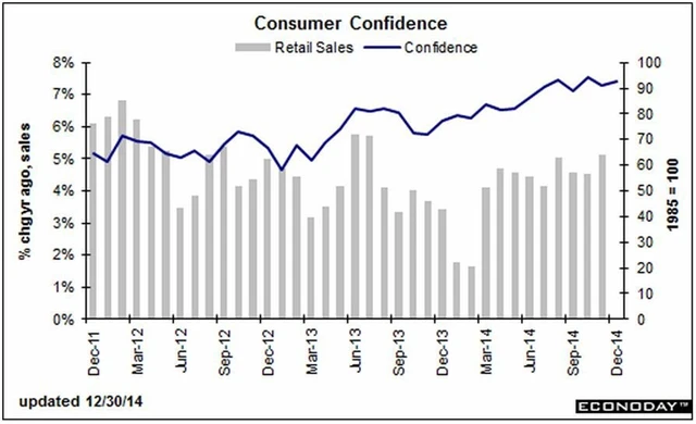 "Důvěra spotřebitelů se celkově mírně zlepšila díky příznivějšímu hodnocení současné hospodářské situace a podmínek na trhu práce," uvedla Lynn Francová, která v Conference Board vede oddělení ekonomických indikátorů. Spotřebitelská očekávání jsou podle ní i přes prosincový pokles stále lepší než na počátku roku.