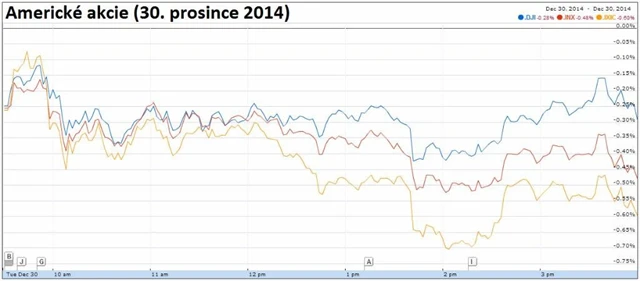 Americké akcie v první polovině úterní obchodní seance mírně oslabovaly. Ve druhé polovině obchodování ztráty zprvu prohloubily, nakonec ale mírně oživily a vrátily se na dopolední úrovně. Investory před koncem roku znepokojuje politická situace v Řecku, kde se v lednu budou konat předčasné parlamentní volby.