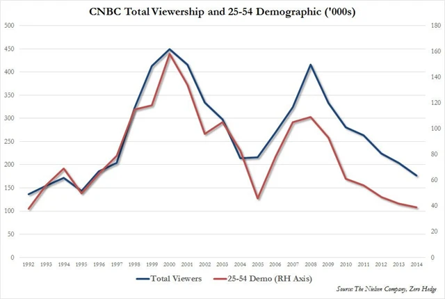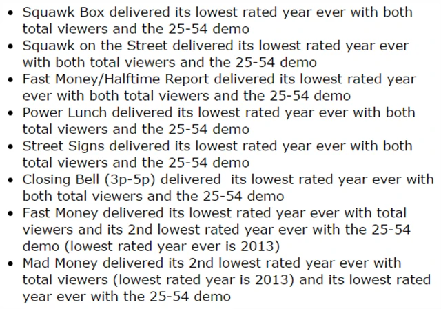 Sledovanost kdysi "povinného vysílání" výrazně klesla. Řada dnes již klasických relací CNBC zažila nejhorší rok v historii, Jim Cramer se svými Mad Money druhý nejhorší.