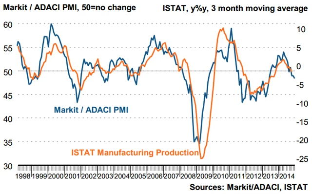 Itálie: Index nákupních manažerů ve zpracovatelském sektoru v prosinci klesl na 48,4 bodu