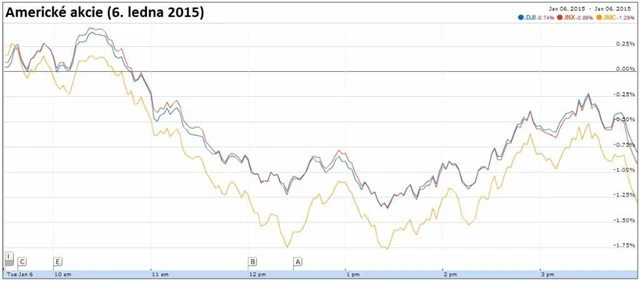 Dow oslabil o 0,74 % na 17 371,64 bodu, širší S&P 500 odepsal 0,89 % na 2 002,61 bodu a technologický Nasdaq uzavřel se ztrátou 1,29 % na 4 592,74 bodu. Index volatility VIX vzrostl přes šest procent na 21,12 bodu a výnosy 10letých vládních dluhopisů USA spadly o devět bazických bodů na 1,94 %.