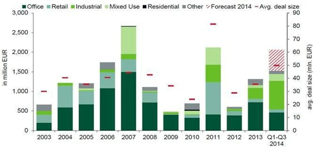 Martin Skalický, předseda představenstva REICO České spořitelny, která se na trh s komerčními nemovitostmi zaměřuje, uvádí, že zejména v oblasti prémiových nemovitostí je český trh likvidní. "Celkové investice v roce 2014 přesáhnou potřetí za posledních deset let 2 miliardy eur," uvedl Skalický těsně před koncem loňského roku. "I když byli investoři aktivní ve všech třech hlavních sektorech realitního trhu (kanceláře, logistika a maloobchod), zejména industriální sektor zaznamenal výrazný nárůst v počtu transakcí v porovnání s předchozím rokem."