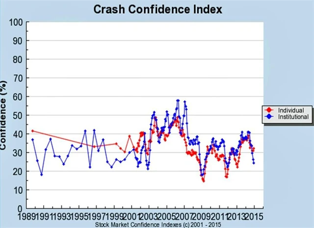Důvěra investorů v to, že se podaří odvrátit kolaps cen amerických akcií během následujících šesti měsíců, se od loňského jara výrazně snížila. Yale School of Management vydává každý měsíc Crash Confidence Index, který ukazuje podíl investorů, kteří věří, že v dalším půlroce nepřijde sešup trhu.