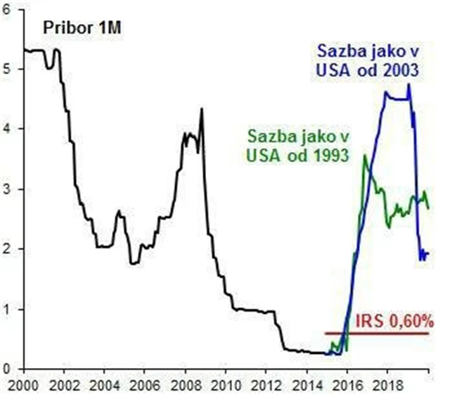 Na prvním obrázku je dosavadní vývoj sazby Pribor 1M, sazba úrokového swapu (5 let s lineárním splácením jistiny úvěru do nuly) a dvě možné cesty úrokových sazeb jako v Americe v minulosti rok před zvyšováním sazeb, tj. od 1993 a 2003.