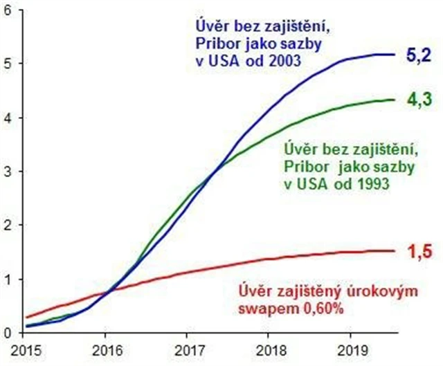 Důležitější než věštit, kde budou sazby, je, kolik se dá úvěru bez zajištění vydělat a kolik se dá bez zajištění prodělat. Náklady se zajištěním úrokovým swapem je jednoduché spočítat, stejně jako náklady v případě, že se sazby už nikdy nezmění. Důležité je, že na dnešním trhu je rozdíl malý. Co se stane, když sazby porostou? Můžeme se podívat, jak by to s úrokovými náklady dopadlo třeba, jako když Amerika zvyšovala úrokové sazby v minulosti.
