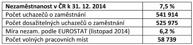 Nezaměstnanost v České republice v prosinci meziměsíčně vzrostla na 7,5 % z listopadových 7,1 %. Bez práce bylo 541 914 lidí, což je o 24 406 víc než o měsíc dříve. Uvedl to v pátek Úřad práce. Oproti prosinci 2013 je ale nezaměstnaných méně, tehdy jejich podíl tvořil 8,2 % a bylo jich skoro o 55 tisíc víc než poslední měsíc loňského roku. Důvodem meziměsíčního růstu nezaměstnanosti v prosinci je podle úřadu tak jako v minulých letech hlavně ukončování sezonních prací.