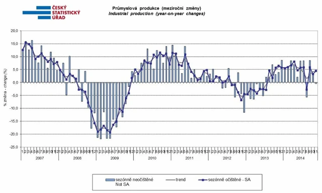 "Listopadové hodnoty za průmysl jsou tak sice ve srovnání s předešlými měsíci opticky výrazně horší, je to však způsobeno výše uvedenými vlivy a po jejich očištění průmysl v listopadu solidně rostl, což odpovídá i optimistickým hodnotám indikátoru nákupních manažerů a indikátorům důvěry," uvedl dále Seidler. "Vzhledem k tomu, že se tyto indikátory v prosinci vyvíjely stále příznivě, kalendářní efekt bude mírně ve prospěch prosince 2014 (+1 den) a zároveň bude příznivě působit i srovnání s nižšími hodnotami z prosince 2013, lze příští měsíc očekávat opět příznivá meziroční čísla. Za celý rok 2014 by tak průmyslová produkce měla růst kolem 5 %, což je ve srovnání s nulovým růstem v roce 2013 příznivé zlepšení," dodal ekonom.