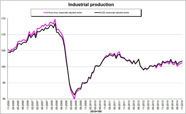 Průmyslová výroba v eurozóně v listopadu vzrostla o 0,2 % meziměsíčně po sezónním očištění, očekávala se stagnace po říjnovém 0,3% růstu (revidováno z 0,1 %). Meziročně bez sezónního očištění se produkce snížila o 0,4 %, trh predikoval 0,7% pokles po říjnovém 0,7% růstu. V celé Evropské unii se produkce meziměsíčně rovněž zvýšila o 0,2 % po říjnových +0,3 %. Meziročně produkce v celé EU klesla o 0,1 %.
