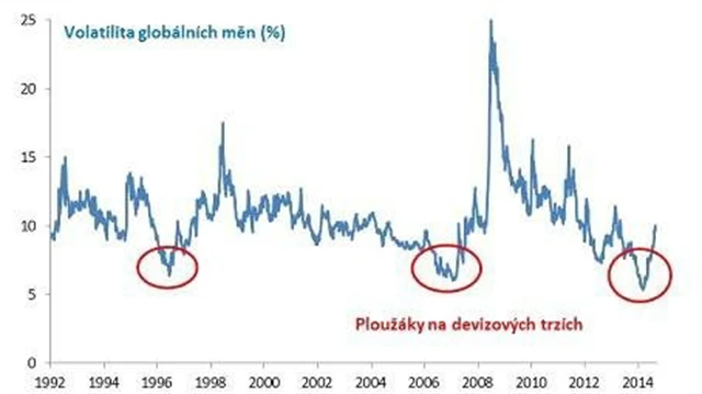 Dnešní rozhodnutí SNB je definitivní tečkou za obdobím nízké volatility na měnových trzích (viz obrázek). Když už se hýbe i frank, je nabíledni, že na devizových trzích ploužáky skončily a teď se hraje řízný Rock’n‘Roll. Spoléhat se, že se kurzy moc nehýbou, může vyjít velmi draho. To ostatně potvrdí dolaroví importéři (více zde: Osedlejte si sílící dolar opcemi).
