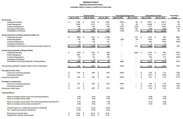 Zisk americké banky Morgan Stanley v loňském čtvrtém čtvrtletí prudce stoupl a dosáhl 920 milionů dolarů. O rok dříve činil jen 36 milionů dolarů, za zlepšením je podle sdělení banky hlavně pokles výdajů na právní zastoupení. Výsledek ale i tak výrazně zaostal za očekáváním analytiků v anketě agentury Reuters.