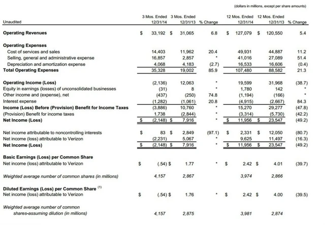 Společnost Verizon ve čtvrtém kvartále loňského roku vykázala účetní ztrátu na akcii ve výši 54 centů oproti zisku 1,76 dolaru na akcii ve stejném období v roce 2013. Po očištění o nezdanitelné položky dosáhla naopak zisku na akcii ve výši 71 centů, což oproti 66 centům v předchozím roce představuje nárůst o 7,6 %. Za celý rok dosáhla Verizon zisku na akcii 2,42 dolaru oproti 4 dolarům v roce 2013, po očištění však zisk meziročně vzrostl o 18 % na 3,35 dolaru oproti 2,84 dolaru na akcii.