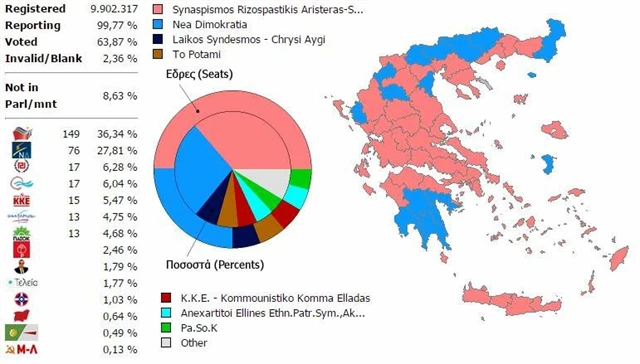 02.10 Průběžné pořadí stran po sečtení hlasů v 94,88 % volebních okrsků: SYRIZA (36,38 %, 149 křesel), Nová demokracie (27,81 %, 76 křesel), Zlatý úsvit (6,29 %, 17 křesel), Potami (6,04 %, 17 křesel), komunisté (5,50 %, 15 křesel), PASOK (4,73 %, 13 křesel), Nezávislí Řekové (4,66 %, 13 křesel).