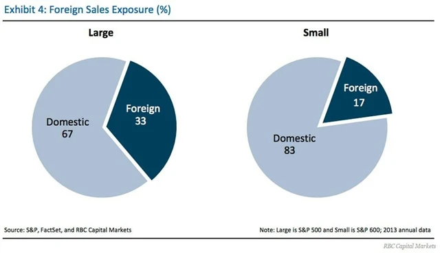 "Přesněji řečeno, když dolar posiluje, rostou valuace velkých firem, protože je nakupují zahraniční investoři," tvrdí Golub. "Malé firmy se těchto kapitálových přesunů neúčastní. Jinými slovy, zatímco jsou zisky malých firem chráněny před silným dolarem, netrpí tím ani jejich valuace."