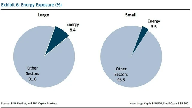 Druhou výhodou malých firem je zlevňující ropa, protože jsou na ni malé firmy citlivější, byť energetické společnosti zastupují v indexu S&P 600 menší podíl než v indexu S&P 500. Tato citlivost podle Goluba vyplývá ze dvou faktorů. Zaprvé oba indexy mají stejně zastoupené společnosti z těžařského sektoru a sektoru služeb citlivé na komodity a zadruhé je zlevňující ropa ukazatelem budoucího růstu a malé firmy jsou více závislé na ekonomické aktivitě.