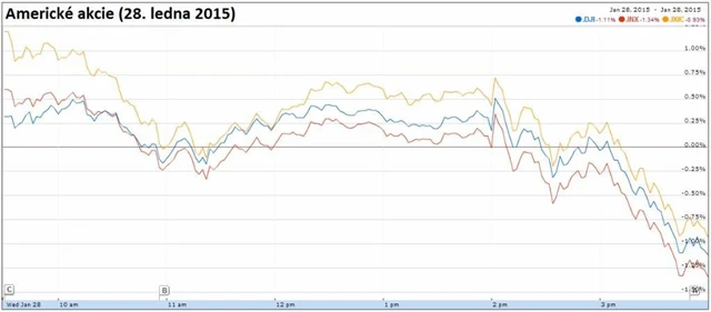 Dow oslabil o 1,13 % na 17 191,37 bodu, širší S&P 500 klesl o 1,35 % na 2 002,16 bodu a technologický Nasdaq odepsal 0,93 % na 4 637,99 bodu. Index volatility VIX vystřelil téměř o 19 % na 20,44 bodu a výnosy 10letých vládních dluhopisů USA klesly o deset bazických bodů na 1,72 %.