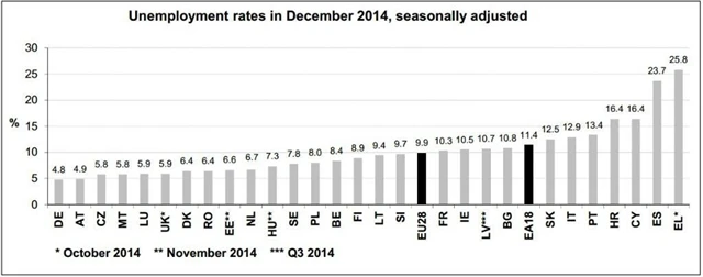 Nejnižší míry nezaměstnanosti v prosinci zaregistrovaly Německo (4,8 %) a Rakousko (4,9 %), nejvyšší naopak Řecko (25,8 % v říjnu 2014) a Španělsko (23,7 %).