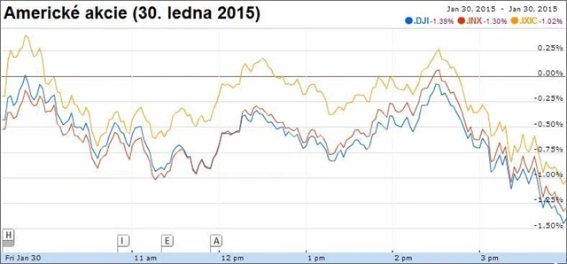 Náladu investorů pokazily v úvodu údaje o nižším než očekávaném růstu amerického HDP ve čtvrtém kvartálu 2014. V reakci na to začaly klesat výnosy bondů a akcie se v úvodu obchodní seance ponořily do ztráty. Během dne sice dokázaly nahlédnout i do plusu, závěr seance ale vyzněl jasně pro medvědy. Nic nepomohla ani oznámená vysoká úroveň spotřebitelské důvěry.
