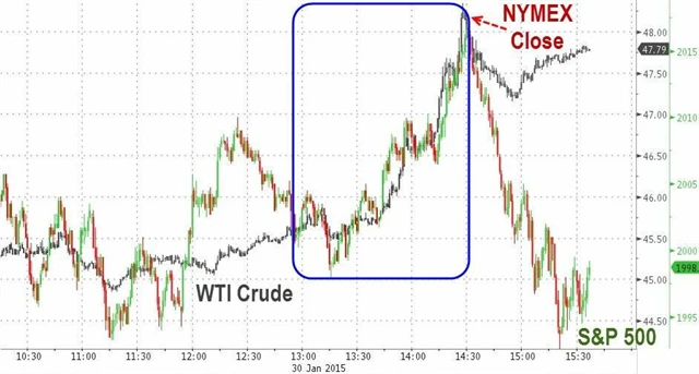 Pro zajímavost, největší posílení indexu S&P 500 během pátku probíhalo ruku v ruce se sérií uzavíraní krátkých pozic ve WTI na burze NYMEX. Příznivci konspiračních teorií, kteří ale nemusejí být daleko od pravdy, v čele se serverem Zero Hedge mají jasno - páteční seance byla plně v režii robotů v rukou těch, kdo potřebovali na konci měsíce rychle vydělat. Je pravda, že graf je velice výmluvný.
