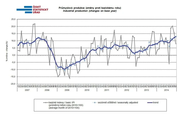 Prosinec 2014 měl ve srovnání se stejným měsícem předchozího roku o 1 pracovní den více. Po očištění od sezónních vlivů (včetně vlivu počtu pracovních dnů) byla průmyslová produkce meziměsíčně vyšší o 0,6 %. K meziročnímu růstu průmyslové produkce nejvíce přispěla odvětví výroba motorových vozidel, přívěsů a návěsů (příspěvek +2,3 procentního bodu, růst o 16,0 %), výroba elektrických zařízení (příspěvek +1,0 p.b., růst o 15,3 %) a výroba strojů a zařízení (příspěvek +0,7 p.b., růst o 7,5 %). Průmyslová produkce klesla v odvětvích výroba a rozvod elektřiny, plynu, tepla a klimatizovaného vzduchu (příspěvek -0,3 p.b., pokles o 2,2 %), těžba a dobývání (příspěvek -0,2 p.b., pokles o 4,4 %) a zpracování dřeva, výroba dřevěných, korkových, proutěných a slaměných výrobků, kromě nábytku (příspěvek -0,1 p.b., pokles o 4,7 %).