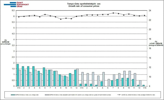 Spotřebitelské ceny vzrostly v lednu proti prosinci 2014 o 0,1 %, očekával se pokles o 0,2 %. Vývoj cen v lednu byl ovlivněn výrazným poklesem cen v oddílech doprava a zdraví, který byl kompenzován zvýšením cen zejména v oddílech alkoholické nápoje a tabák, rekreace a kultura, potraviny a nealkoholické nápoje. Meziroční růst spotřebitelských cen zůstal v lednu stejný jako v prosinci 2014, tedy 0,1 %, rovněž se přitom očekával pokles o 0,2 %.