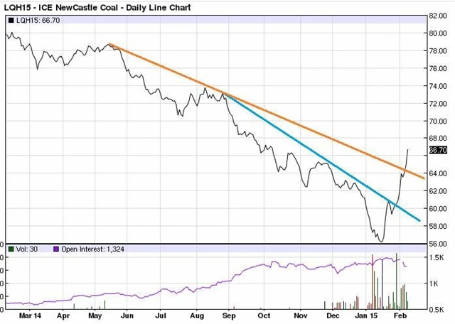 A zdražování australského uhlí by mohlo pokračovat. Ceny totiž směrem nahoru prorazily nejen krátkodobou, ale i roční klesající trendovou čáru, a to opravdu masivně.
