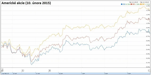 Dow posílil o 0,79 % na 17 868,76 bodu, širší S&P 500 vzrostl o 1,07 % na 2 068,59 bodu a technologický Nasdaq uzavřel se ziskem 1,30 % na 4 787,65 bodu. Index volatility VIX klesl o více než 7 % na 17,23 bodu a výnosy 10letých vládních dluhopisů USA stouply o dva bazické body na 2 %.