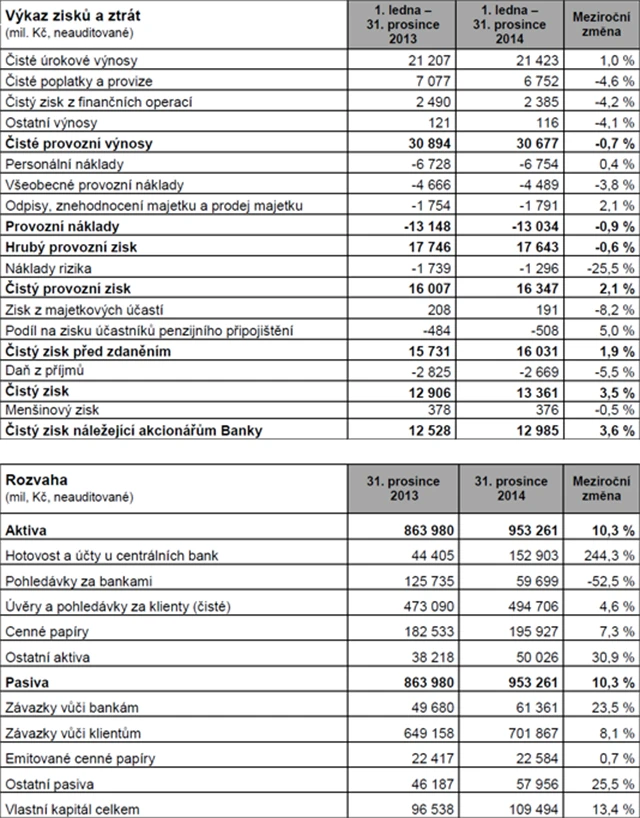 Celkový výnos z úroků narostl za celý rok o procento na 2,423 miliardy Kč, čistý zisk se zvýšil o 3,5 % (v souladu s odhady) na 13,361 miliardy Kč, zisk pro akcionáře stoupl o 3,6 % na zmíněných 12,985 miliardy Kč.
