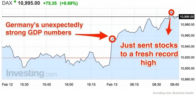 "11 000 bodů je psychologicky důležitých," vysvětluje viceprezident ženevské Mirabaud Securities John Plassard. "Potvrzuje to vedoucí pozici Německa v eurozóně. Domácí poptávka Němcům umožnila vymanit se z ekonomického zpomalení. Po překonání této hranice může trh růst ještě výše."