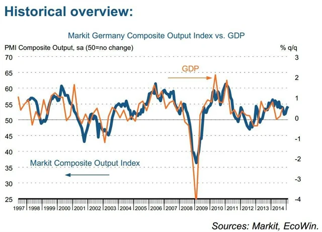 Němečtí výrobci v únoru podle průzkumu agentury Markit (na základě 85 % odpovědí) v únoru zaznamenali lepší ekonomické podmínky a díky tomu výrazný nárůst nových zakázek. Lepší byla situace v sektoru služeb, kde celková aktivita vyskočila na pětiměsíční maximum. Ve zpracovatelském sektoru výrobci zaznamenali především nárůst nových zakázek ze zahraničí díky slabšímu euru a celkově došlo k výraznému nárůstu zaměstnanosti, byť se stále pohybuje na hladinách nižších než po většinu roku 2014.