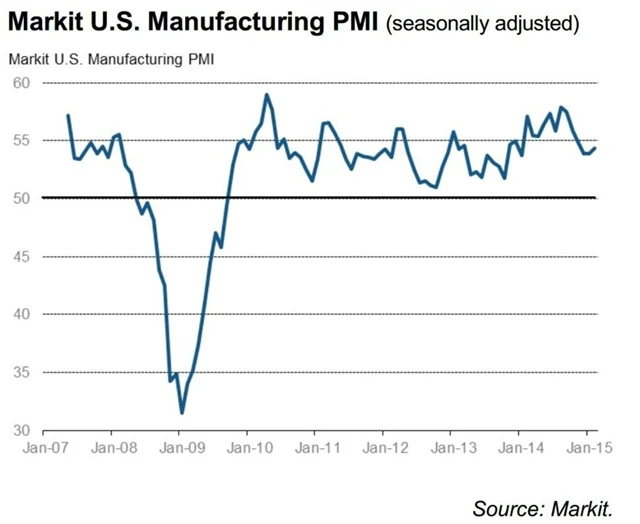 Předběžný index nákupních manažerů v americkém zpracovatelském sektoru v únoru nečekaně vzrostl na 54,3 bodu z 53,9 bodu v lednu. Očekával se pokles na 53,6 bodu. Únorový výsledek je nejlepší od listopadu loňského roku, stále je však horší než průměr v roce 2014 (55,9 bodu). Index sledující nové zakázky však v únoru klesl a index sledující nové pracovní místa v sektoru rostl nejpomalejším tempem od ledna 2014. Zakázky do zahraničí se navíc přiblížily stagnaci.