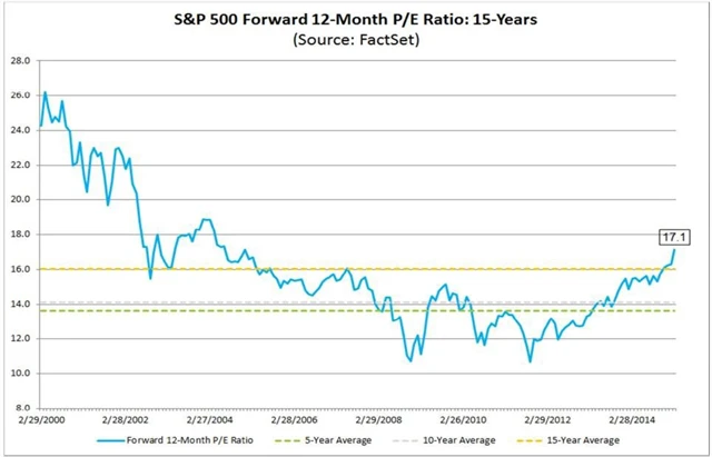 Současný 12měsíční předstihový ukazatel P/E je o mnoho vyšší než tři nejaktuálnější průměry: 5letý (13,6), 10letý (14,1) a 15letý (16,0). Přes hladinu 17,1 se nyní poměr P/E dostal poprvé od 31. prosince 2004. Tehdy byla zavírací hodnota indexu S&P 500 jen 1 211,92 bodu a 12měsíční odhad zisku na akcii (EPS) 70,79 USD.