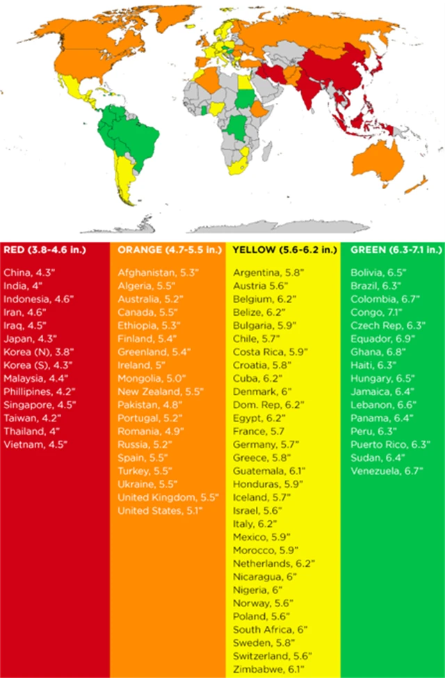 Češi jsou na tom dost dobře, Američané naopak zaostávají, no a největší (tedy nejmenší) problém mají v KLDR. Údaje jsou v palcích, pro centimetrovou míru násobte zhruba 2,5krát.