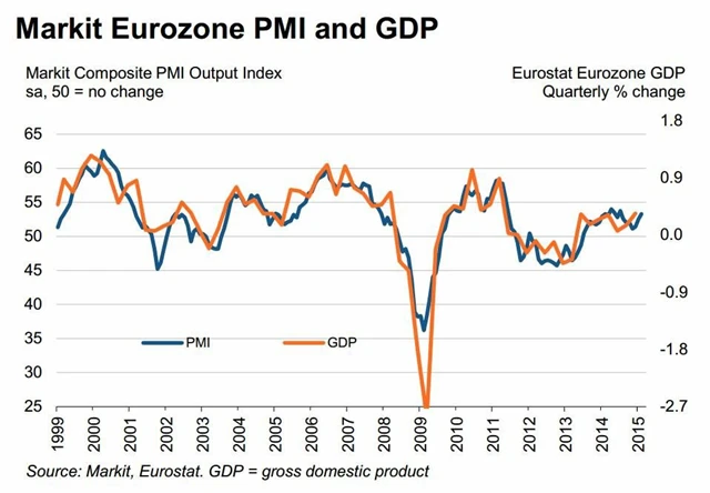 Kompozitní index ekonomické aktivity eurozóny se již 20 měsíců v řadě nachází nad klíčovou 50bodovou hranicí, která je předělem mezi růstem a poklesem aktivity. Hodnota indexu podle firmy Markit signalizuje, že hospodářský růst eurozóny v letošním prvním čtvrtletí dosáhne 0,3 %, tedy stejného tempa jako v předchozích třech měsících.