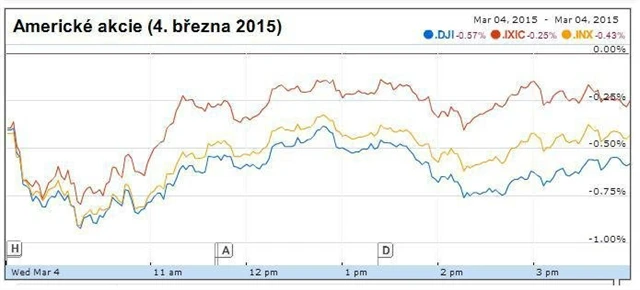 Data z americké ekonomiky Wall Street ve středu k růstu neinspirovala. Přírůstek pracovních míst v soukromém sektoru byl v únoru o něco nižší, než se čekalo. Nevýrazný byl i nárůst aktivity v americkém sektoru služeb podle indexu institutu ISM. Akcie tak druhý den v řadě sestupovaly z rekordních maxim a zakončily obchodování v červených číslech.