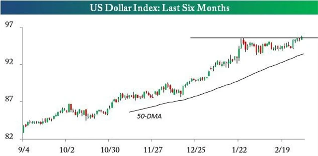 Dolarový index, který měří výkon americké měny ke koši šesti dalších hlavních měn, se po poklesu z přelomu ledna a února vrátil zpět na několikaletá maxima. Navíc prorazil hladinu odporu 95 bodů, z níž by se nyní měl stát poměrně silný support.
