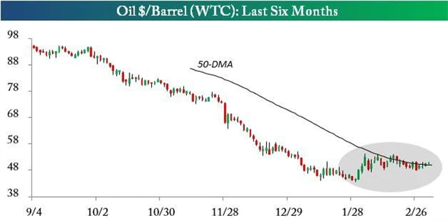 Severoamerická lehká ropa WTI na konci ledna narazila na lokální dno, když se její cena dostala až pod 45 dolarů za barel. Od té doby zdražila zhruba o deset procent a aktuálně se její cena pohybuje kolem 50denního klouzavého průměru mírně nad 50 dolary za barel. Investoři nyní vyčkávají, zda se ropě podaří udržet nad touto úrovní. Pokud ano, bude to indikovat možnost dalšího růstu ceny.