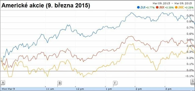 Index Dow posílil o 0,78 % na 17 995,72 bodu, S&P 500 přidal 0,39 % na 2 079,43 bodu a Nasdaq zpevnil o 0,31 % na 4 942,44 bodu. Nejvíce se dařilo akciím průmyslových firem, cyklickým spotřebitelským titulům a odvětví zdravotní péče, v mínusu zůstaly energetika, základní materiály a síťové služby. Index volatility VIX se téměř nezměnil a zůstal na úrovni 15 bodů. Výnos 10letých vládních dluhopisů USA klesl o 5 bazických bodů na 2,19 %.