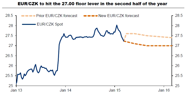 1. Zahájené kvantitativní uvolňování ECB působící ve směru slabšího eura, tedy i posilování koruny vůči euru. ING předpokládá paritu EUR/USD do konce roku 2015, primárně z titulu silnějšího dolaru zapříčiněného zahájením zvyšování sazeb Fedu v létě tohoto roku. Teoreticky je tedy možné, že ČNB bude muset kvůli QE ze strany ECB také navyšovat svou bilanci.