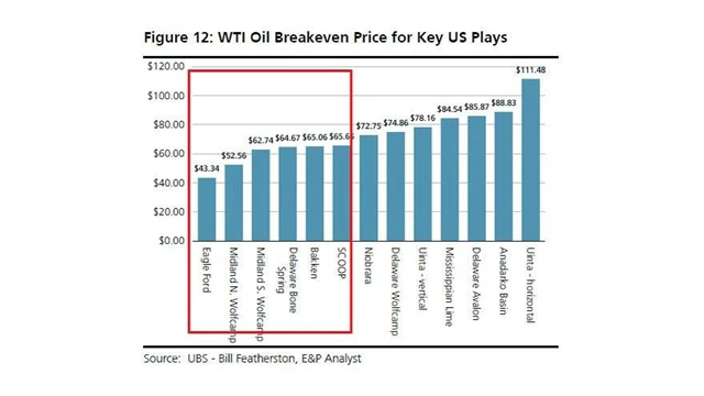 I u břidličné ropy jsou ale náklady na těžbu různé. Takzvaný bod zvratu, tedy cena, při které těžaři ani neprodělávají, ale ani nevydělávají, se v USA liší podle oblastí, ve kterých těžba probíhá. Vůbec nejnižší náklady na vytěžení ropy mají firmy v břidličné pánvi Eagle Ford a oblasti Wolfcamp, kde bod zvratu dosahuje 43,34 USD, respektive 52,56 USD za barel. Nejnákladnější je naopak s bodem zvratu 111,48 USD za barel těžba v pánvi Uinta.