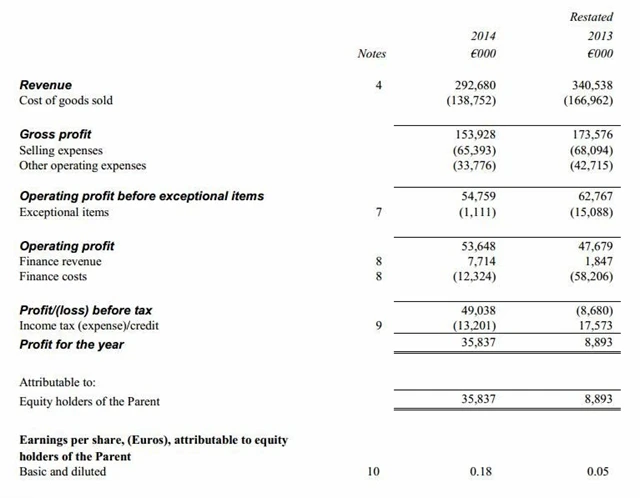 Provozní zisk ale společnosti loni meziročně vzrostl ze 47,7 milionu EUR na 53,6 milionu EUR a zisk po zdanění narostl z 8,9 milionu EUR na 35,8 milionu EUR. Firma dále uvedla, že navrhne vyplacení dividendy z loňského zisku ve výši 0,025 EUR na akcii. V září 2014 již vyplatila mezitimní dividendu 0,0125 EUR na akcii.