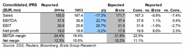 Analytici z Erste Group Bank odhadovali, že společnost za rok 2014 vykáže zisk EBITDA 65,5 milionu EUR a tržby 309,5 milionu EUR. Trh čekal tržby 308 milionů EUR.