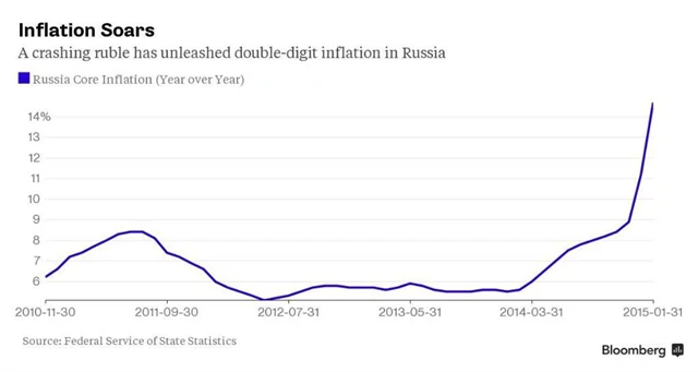 Meziroční tempo inflace v Rusku v únoru vzrostlo na 16,7 %, ještě v polovině minulého roku přitom dosahovalo "jen" asi 7,5 %. Inflaci vzhůru ženou také nízké ceny ropy, která je pro zemi strategickou surovinou. Bez ní by de facto neexistovala ruská ekonomika.